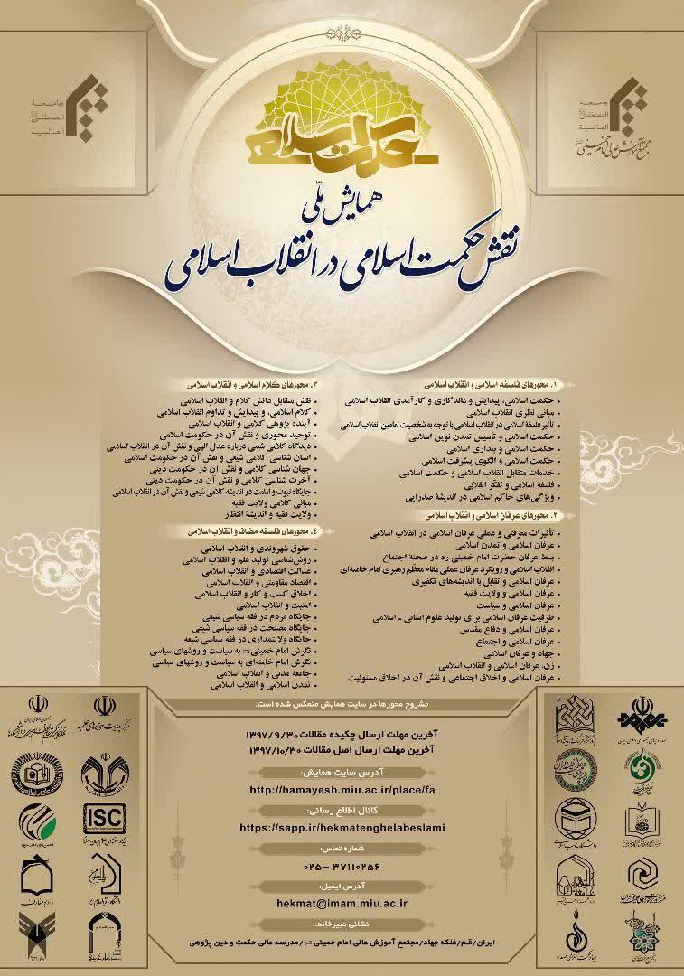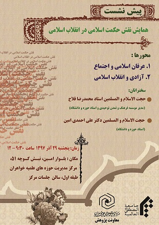 پیش نشست همایش «نقش حکمت اسلامی در انقلاب اسلامی» حول محورهای 1. عرفان اسلامی و اجتماع 2. آزادی و انقلاب اسلامی در تاریخ پنج شنبه 29 آذر ساعت 9:30-12 در سالن جلسات مرکز مدیریت حوزه های علمیه خواهران با حضور سخنرانان و مهمانان برگزار می گردد. حضور علاقه مندان، طلاب و اساتید را گرامی می داریم. شایان ذکر است پخش زنده این برنامه در شبکه کوثرنت برای طلاب خواهر سراسر کشور قابل مشاهده است.