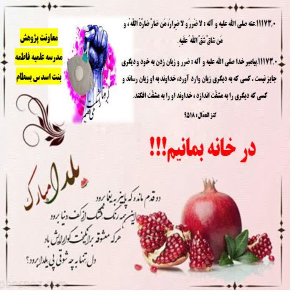 به گزارش معاونت پژوهش مدرسه علمیه فاطمه بنت اسدس بسطام در مورخ 30.9.99 به مناسبت شب یلدا عکس نوشته ای تهیه و در بین طلاب توزیع گردید.
