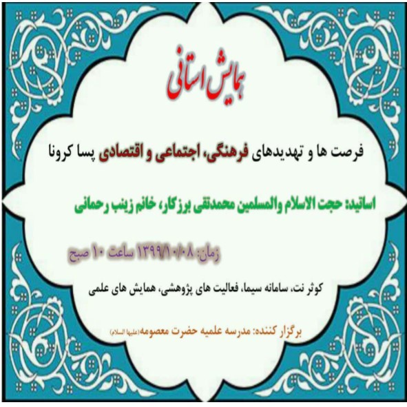به گزارش معاون پزوهش مدرسه علمیه حضرت معصومه(س) همایش استانی با عنوان فرصت ها و تهدیدهای فرهنگی، اجتماعی، اقتصادی پسا کرونا در فضای مجازی برگزار شد.