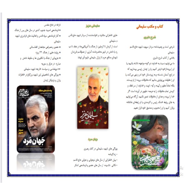 تهیه و تنظیم بروشور با عنوان کتاب و مکتب سلیمانی به مناسبت اولین سالگرد شهادت سردار بزرگ اسلامدر مدرسه علمیه حضرت معصومه سلام الله علیها صورت گرفت .