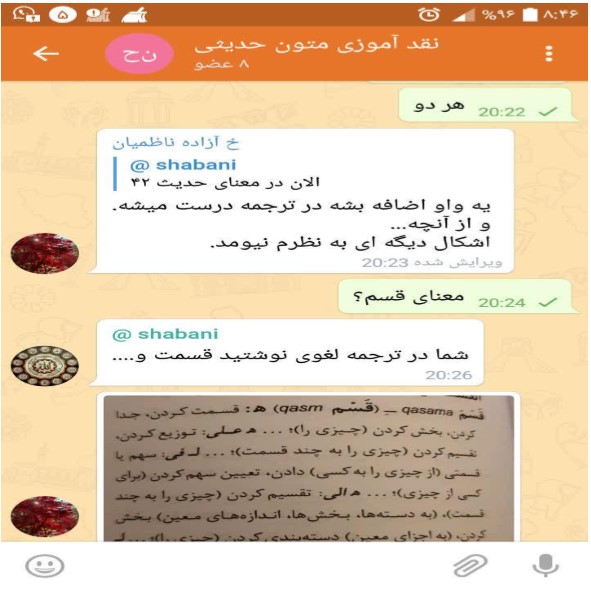 در اين جلسه كه در تاريخ 11/04/99 به صورت مجازي در پيام رسان ايتا برگزار شد، پژوهشگران به نقد و بررسي و تبادل نظر پيرامون احاديث 41 تا پايان حديث 45 كتاب نهج الفصاحه پرداختند. لازم به ذكر است اين جلسه به صورت هفتگي برگزار مي شود.