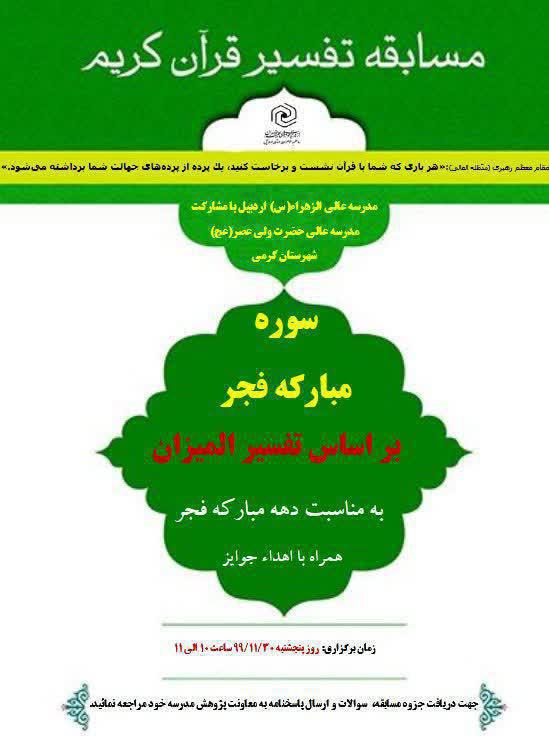 مسابقه تفسیر سوره مبارکه فجر به مناسبت ایام الله دهه فجر با مشارکت دو مدرسه عالی الزهرا(سلام الله علیها) اردبیل و حضرت ولی عصر(عج) شهرستان گرمی در مورخ 99/11/30 ساعت 10 الی 11 صبح برگزار خواهد شد.