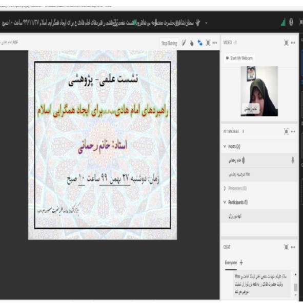 این نشست با عنوان راهبردهای امام هادی برای ایجاد همگرایی اسلامی و سخنرانی خانم رحمانی استاد حوزه در سامانه سیما برگزار شد.