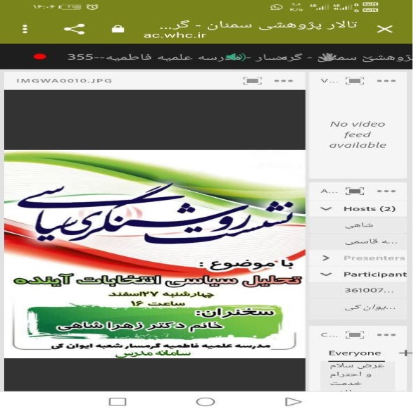 به همت شعبه ایوانکی مدرسه علمیه فاطمیه گرمسار نشست مجازی روشنگری سیاسی با موضوع تحلیل سیاسی انتخابات آینده در سامانه مدرس با حضور استاد ارجمند خانم شاهی برگزار گردید.در ابتدای جلسه خانم شاهی ضمن تبریک فرارسیدن اعیاد شعبانیه و با توجه به نزدیکی انتخابات به حضور فعال مردم در فضای مجازی اشاره کردند: نباید به اخبار و شایعه های فضای مجازی توجه کرد و اخبار موثق را تنها از کانال های رسمی پیگیری کرد.در ادامه به بیان شاخص های انتخاب کاندیدای اصلح پرداختند که از مهم ترین آنها تقوا، ولایتمداری و تخصص می باشد.و در آخر توصیه به دعوت مردم برای مشارکت و حضور حداکثری در انتخابات نمودند.