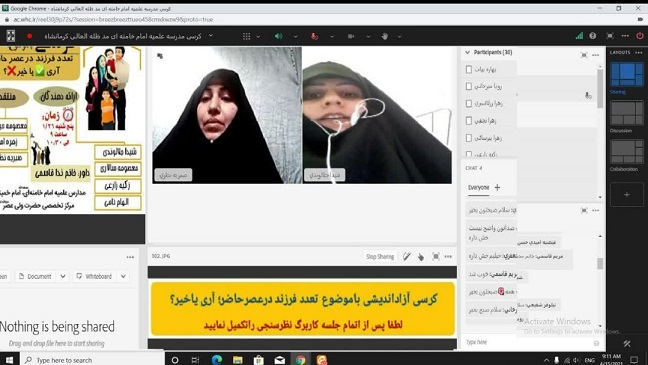 کرسی آزاد اندیشی استانی با عنوان« تعدد فرزند در عصر حاضر آری یا خیر» در سامانه سیما توسط مدرسه علمیه امام خامنه ای مد ظله العالی با همکاری مدرسه علمیه امام خمینی(ره) و مرکز تخصصی حضرت ولی عصرعج الله تعالی فرجه الشریف برگزار گردید