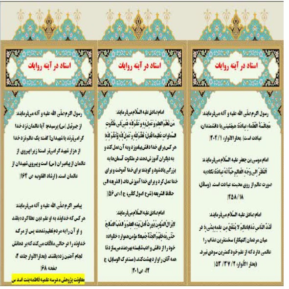 به گزارش معاونت پژوهش مدرسه علمیه فاطمه بنت اسدس بسطام به مناسبت روز معلم و تکریم مقام استاد بروشوری با عنوان استاد در آینه روایات تهیه و در فضای مجازی برای بهره گیری طلاب منتشر گردبد.