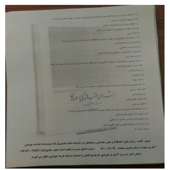 مسابقه کتابخوانی(استانی) با عنوان «« ریشه های انحطاط و عقب ماندگی مسلمانان در اندیشه امام خمینی(ره)» برگزار شد.