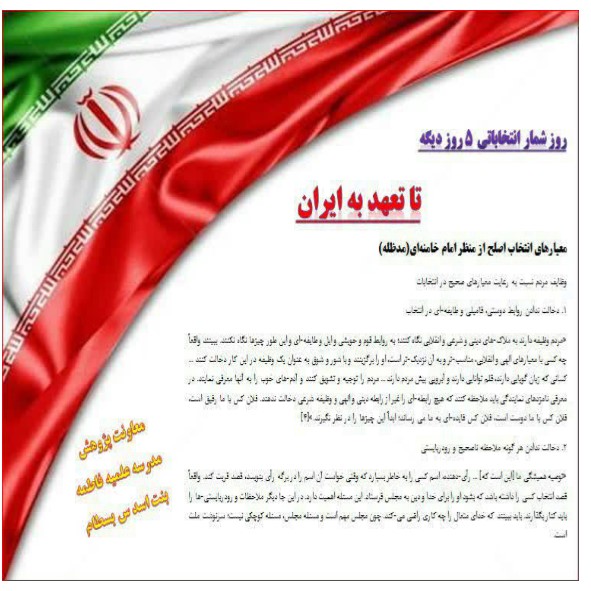 به گزارش معاونت پژوهش مدرسه علمیه فاطمه بنت اسد س بسطام با توجه به نزدیک شدن به انتخابات ، روزشمار انتخاباتی با رویکرد تعهد به ایران تهیه و در فضای مجازی برای بهره گیری طلاب منتشر گردید.