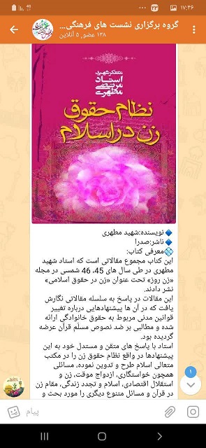 مرضیه علیزاده در ادامه به معرفی اثر دیگری از مجموعه آثار شهید مطهری پرداخته و گفتند: کتاب نظام حقوق زن در اسلام از جمله کتابی است که طلاب سطح دو می توانند آنها را در حین تحصیل مطالعه نمایند زیرا مطالعه آثار شهید مطهری علاوه بر جنبه های علمی ، جنبه تفکر و تامل را نیز در مخاطب تقویت می کند.