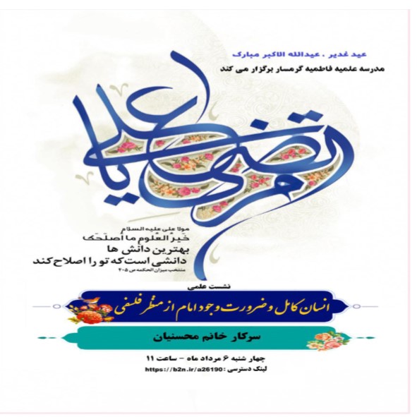به مناسبت عید ولایت وامامت ؛ عید غدیر خم مدرسه علمیه فاطمیه گرمسار نشست علمی ؛ انسان کامل وضرورت وجود امام از منظر فلسفی با حضور ارزشمند:سرکار خانم محسنیان در روز چهارشنبه ۶ مرداد ماه برگزا رنمود . در این نشست استاد محسنیان ضمن تبیین اهمیت وجود امام به تبیین ابعاد مساله ضرورت وجود امام پرداخت و به استدلال هایمتکلمان شیعه و سنی و که اشاره نمود ند . ایشان در ادامه منابع مرتبط با بحث را به منظور استفاده طلاب معرفی نمودند .