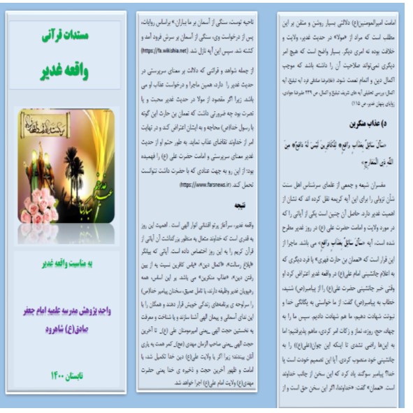 بروشوری با عنوان« مستندات قرآنی غدیر» درمدرسه علمیه امام جعفر صادق(ع) شاهرود منتشر شد.