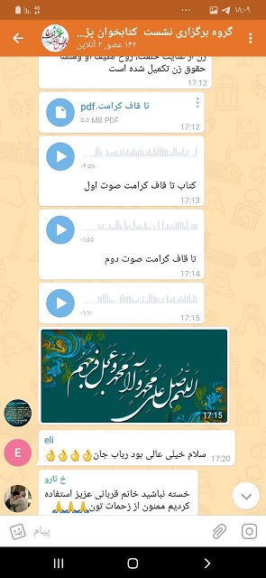 عضو فعال کانون پژوهشی مدرسه علمیه الزهرا (سلام الله علیها) خلخال در بخش دیگری از نشست به خوانش صفحاتی منتخب از این کتاب پرداخته و همزمان فایل نوشتاری این صفحات را در اختیار اعضای نشست قرار داده تا مخاطبین نیز به خوانش صفحاتی از این کتاب در مدت تعیین شده بپردازند.