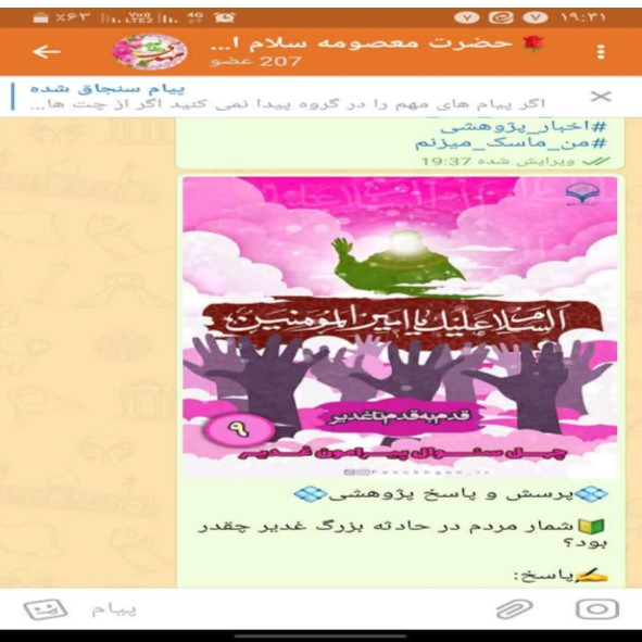 سلسله پرسش های غدیریه با عنوان پرسش و پاسخ پژوهشی در فضای مجازی مدرسه علمیه حضرت معصومه سلام الله علیها در ایام غدیرانجام شد . عامری معاونت پژوهش مدرسه هدف از فعالیت مذکور را اشنایی طلاب با مسائل و شبهات پیرامون واقعه غدیر اعلام کرد .