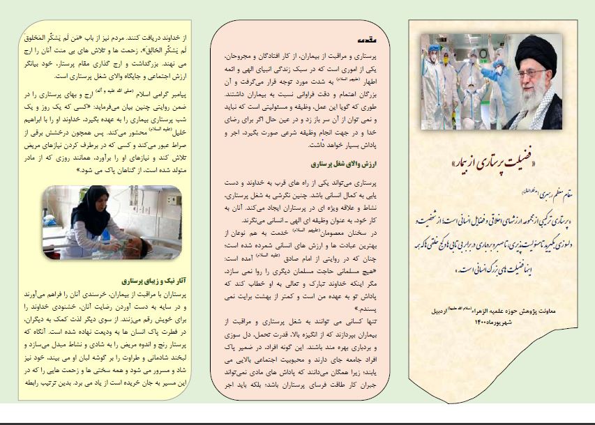 وی افزود: در این بروشور ارزش والای شغل پرستاری و ثمرات خوبی که این شغل می تواند به دنبال داشته باشد مورد توجه قرار گرفته و با توزیع آن در بین مسئولین و کادر بیمارستان ارادت حوزه های علمیه خواهران به این قشر از زحمت کشان جامعه اعلام شده است.