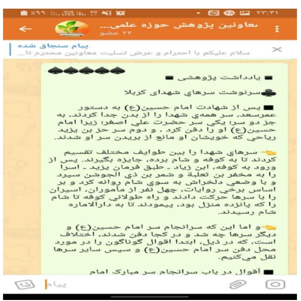 به مناسب آغاز سال قمری و عزاداری امام حسین(علیه السلام) و یاران با وفای ایشان الهه نوروزی سرپرست پژوهش مدرسه علمیه حضرت معصومه(علیها السلام) مطالبی با عنوان سرنوشت شهدای کربلا، روزنهضت عاشورا، وابستگی به دنیا در کلام امام حسین(علیه السلام) و... در قالب یاد داشت های پژوهشی در پیام رسان ایتا بارگذاری کردند