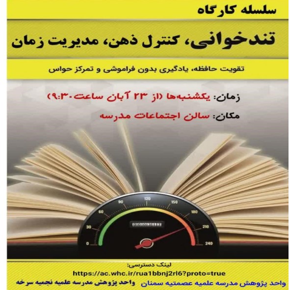 مدرسه علمیه نجمیه سرخه با مشارکت مدرسه علمیه عصمیه سمنان کارگاه تندخوانی، کنترل ذهن، مدیریت زمانبا حضور سرکار خانم وطنی پوربا هدف تقویت حافظه، یادگیری بدون فراموشی و تمرکز حواس برگزار شد.