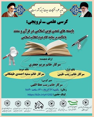 به همت معاونت پژوهشی حوزه علمیه خواهران بندرلنگه، کرسی علمی-ترویجی با موضوع بایسته های تمدن نوین اسلامی در قرآن و سنت، با تأکید بربیانیه گام دوم انقلاب اسلامی با ارائه خانم مریم جعفری و ناقدان خانم ها زینب طیبی و سمیه احمدی طیفکانی با دبیری سرکار خانم زینب عطاءاللهی در تاریخ یکشنبه 21 آذر ماه 1400 برگزار شد.این کرسی با همکاری مرکز مدیریت حوزه علمیه خواهران استان هرمزگان، بسیج اساتید خواهران دانشگاه فرهنگیان استان قم، مدرسه علمیه کوثر بندرلنگه، مؤسسه آموزش عالی فاطمه معصومه (سلام الله علیها)بندرعباس،مدرسه علمی عالی حضرت آمنه(علیها سلام)، مدرسه علمیه نرجسیه(سلام الله علیها)رودان، مدرسه علمیه حضرت زینب(سلام الله علیها)میناب ومدرسه علمیه فاطمه بنت رسول(سلام الله علیها)جاسک در بستر فضای مجازی برگزار شد.