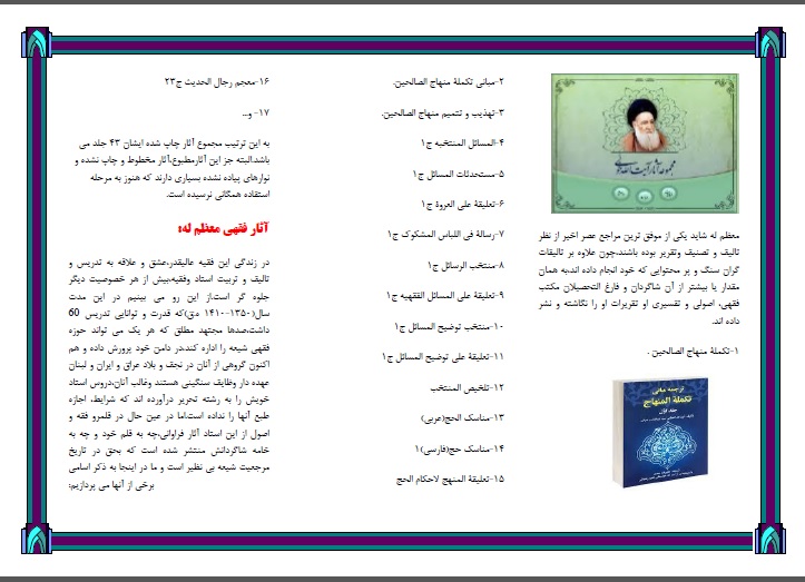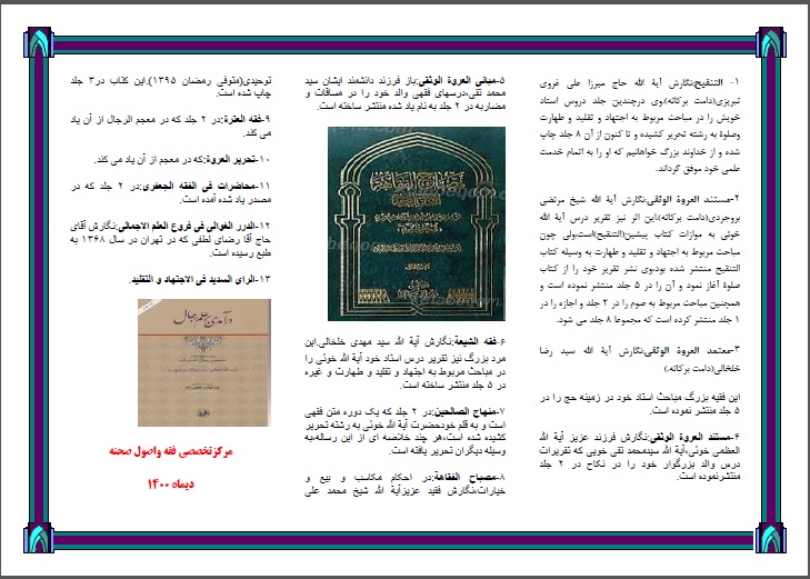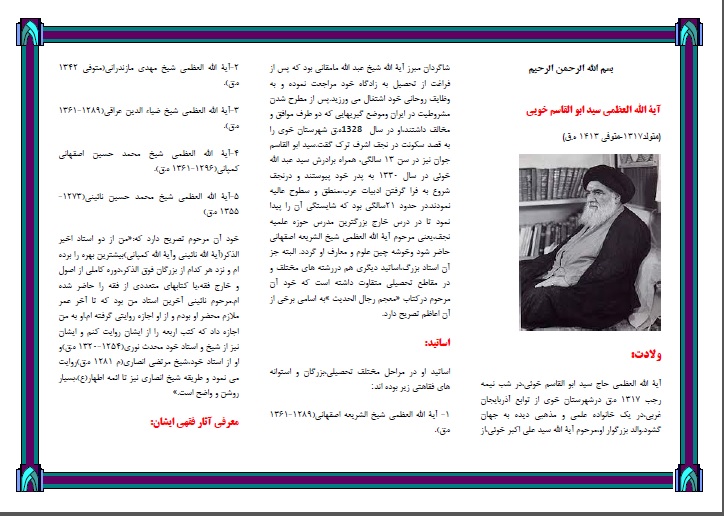 مرکز تخصصی فقه واصول شهرستان صحنه در دیماه 1400 اقدام به تهیه بروشور باعنوان «معرفی شخصیت آیت الله خویی» نمود.