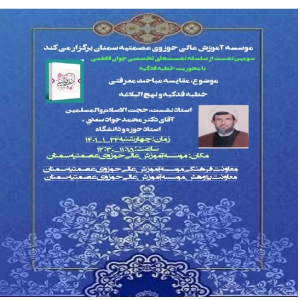 موسسه آموزش عالی حوزوی عصمتیه سمنان سومین نشست از سلسله نشست های تخصصی جوان فاطمی با محوریت خطبه فدکیه باموضوع " مقایسه مباحث معرفتی خطبه فدکیه و نهج البلاغه "را برگزار نمود .