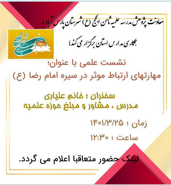 استاد حوزه علمیه ثامن الحجج (علیه السلام) شهرستان پارس آباد با تاکید بر ویژگی های مهارتی در برقراری ارتباط موثر در گفتار و رفتار امام رضا (علیه السلام) گفت: توجه به خصوصیات فردی از جمله مودت و مهربانی ، مدارا، نرم خویی، تکریم ، اعتماد آفرینی می تواند تاثیری شگرف در برقراری ارتباط فردی یا گروهی داشته باشد.