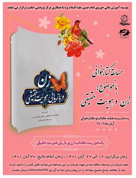 به مناسبت فرارسیدن هفته کتاب (24 آبان 1401)، مسابقه کتابخوانی با موضوع زن و هویت حقیقی با محوریت کتاب زن و بازیابی هویت حقیقی