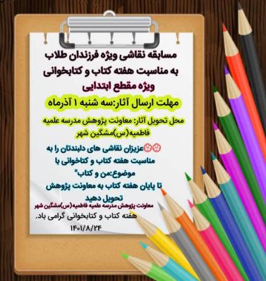 به همت معاونت پژوهش مدرسه علمیه فاطمیه (سلام الله علیها) مشگین شهر، مسابقه نقاشی ویژه فرزندان طلاب مدرسه مشگین شهر در هفته کتاب و کتابخوانی برگزار شد.