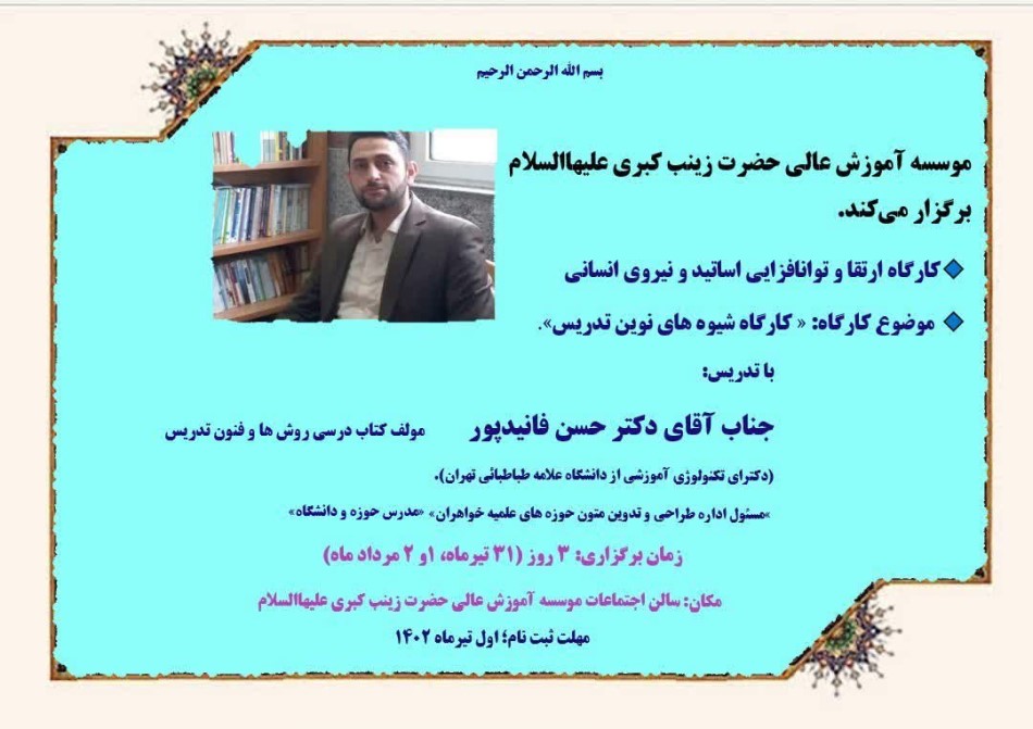 موسسه آموزش عالی حضرت زینب کبری علیهاالسلام برگزار می کند: « کارگاه شیوه های نوین تدریس» و « ارتقا و توانافزایی اساتید و نیروی انسانی» با حضور استاد ارجمند جناب آقای دکتر حسن فانیدپور «رئیس اداره طراحی و تدوین متون تحصیلی حوزه های علمیه خواهران» و از اساتید برجسته پژوهشی و آموزشی در کشور، دکترای تکنولوژی آموزشی از دانشگاه علامه طباطبایی تهران، مولف کتاب روشها و فنون تدریس، مولف کتاب مهارتهای پژوهشی، پژوهشگر و محقق برجسته حوزه و دانشگاه، مدرس کارگاه های مطرح حوزوی و دانشگاهی، مدرس روش تدریس حوزه و دانشگاه