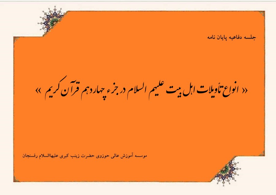 به گزارش معاون پژوهش موسسه آموزش عالی حوزوی حضرت زینب کبری علیهاالسلام رفسنجان سر کار خانم مریم نقش بند، جلسه دفاع پایان نامه سطح سه رشته تفسیر و علوم قرآن سرکار خانم اعظم ايماني زاده شريف پور با عنوان «انواع تأويلات اهل بيت عليهم السلام در جزء چهاردهم قرآن كريم » به راهنمایی حجت الاسلام والمسلمین جناب آقای محمد هادي قهاري كرماني و داوری حجت الاسلام و المسلمین جناب آقای محمدرضا امين، در روزپنج شنبه 1399/06/13 به صورت حضوری و مجازی در موسسه برگزار گردید.