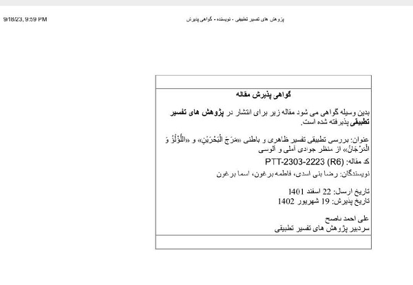 به گزارش خانم مرادی معاونت پژوهش مؤسسه آموزش عالی حوزوی امام حسین علیه السلام، طلابی که در کارگاه فاخر مقاله نویسی با حضور حجت الاسلام و المسلمین آقای دکتر بنی اسدی حضور داشتند، مقالات خود را با همراهی استاد بزرگوار به چاپ رسانده اند. از جمله مقاله مشترک آقای دکتر بنی اسدی و خانم ها فاطمه برغون و اسماء برغون، با عنوان «بررسی تطبیقی تفسیر «مَرَجَ الْبَحْرَیْنِ» و «اللُّؤْلُؤُ وَ الْمَرْجَانُ» از منظر جوادی آملی و آلوسی» در مجله علمی پژوهشی «پژوهش های تفسیر تطبیقی» پذیرش شده است و در شماره های آتی این دوفصلنامه که رتبه الف وزارت علوم را دارد، چاپ خواهد شد.