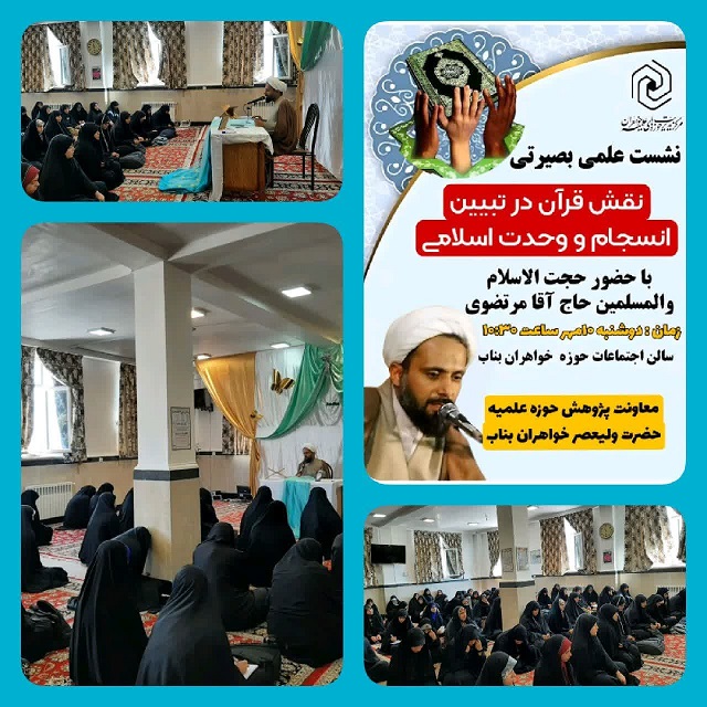 به مناسبت میلاد پیامبر اکرم (صلی الله علیه و آله و سلم) و آغاز هفته وحدت نشست علمی بصیرتی با موضوع«نقش قرآن در تبیین انسجام و وحدت اسلامی» در سالن اجتماعات حوزه خواهران بناب توسط استاد حوزه در مورخ دوشنبه ۱۰مهر ۱۴۰۲برگزار گردید