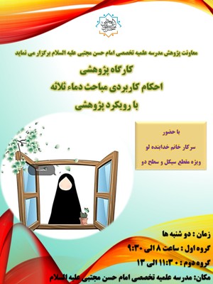 معاونت پژوهش مدرسه علمیه تخصصی امام حسن مجتبی علیه السلام، کارگاه پژوهشی با موضوع (کارگاه پژوهشی احکام کاربردی مباحث دماء ثلاثه با رویکرد پژوهشی) با ارائه سرکار خانم خدابنده لو برگزار می نماید. این کارگاه ویژه طلاب سیکل و دیپلم مقطع سطح دو در روزهای دوشنبه ساعت 8 برای گروه اول و ساعت 11:30 برگزار خواهد شد.