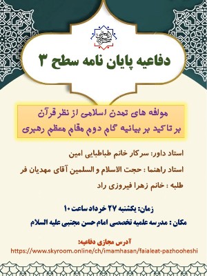 معاونت پژوهشی موسسه آموزش عالی حوزوی امام حسن مجتبی (علیه السلام) تهران ،جلسه دفاعیه طلبه سطح سه رشته تفسیر ،خانم زهرا فیروزی راد باعنوان مولفه های تمدن اسلامی از نظر قرآن بر تاکید بر بیانیه گام دوم مقام معظم رهبری به داوری خانم طباطبایی امین و راهنمایی حجت الاسلام والمسلمین آقای مهدیان فر در تاریخ 1403/3/27 روز یکشنبه ساعت 10 صبح خبر داد.