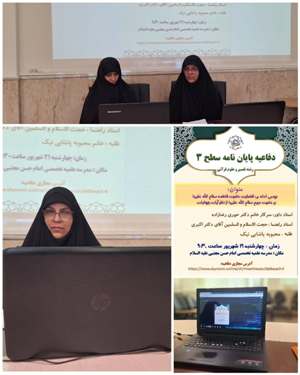 برگزاری جلسه دفاعیه سطح ۳ رشته تفسیر و علوم قرآنی باعنوان: " بررسی ادله ی افضلیت حضرت فاطمه سلام الله علیها بر حضرت مریم سلام الله علیها از نظر آیات و روایات " توسط پژوهشگر محترم خانم محبوبه پاشایی نیک با راهنمایی حجت الاسلام والمسلمین آقای دکتر اکبری و داوری سرکار خانم دکتر رضازاده ، در روز چهار شنبه ۲۱ شهریور ماه ۱۴۰۳ ساعت ۹:۳۰ صبح در مدرسه علمیه تخصصی امام حسن مجتبی علیه السلام با حضور جمعی از اساتید و طلاب برگزار گردید و رساله طلبه با کسب رتبه عالی پذیرفته شد.