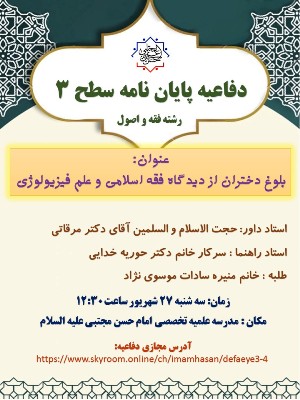 معاونت پژوهشی موسسه آموزش عالی حوزوی امام حسن مجتبی (علیه السلام) تهران ،جلسه دفاعیه طلبه سطح سه رشته فقه و اصول ،خانم منیره سادات موسوی نژاد خبر داد.
