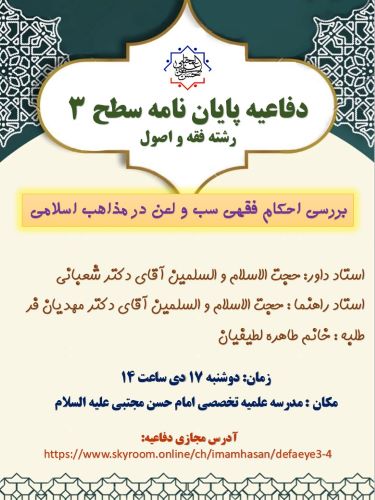 جلسه دفاعیه سطح سه رشته فقه و اصول اکرم لطیفیان با عنوان بررسی احکام فقهی سب و لعن در مذاهب اسلامی روز دوشنبه17 دی ماه ۱۴۰۳ساعت 14 برگزار خواهد شد.