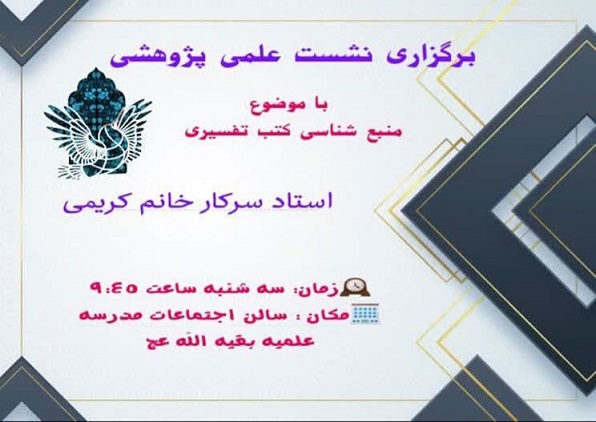 نشست علمي پژوهشي با عنوان منبع شناسي كتب تفسيري در مدرسه علميه بقيه الله (عج) در هفته پژوهش با حضور استاد سركار خانم كريمي برگزار شد.