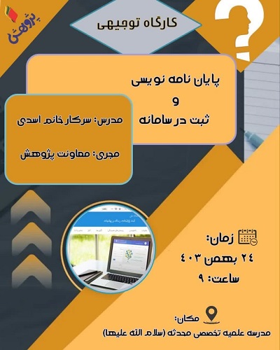 در این کارگاه که در مورخ 1403/11/24 از ساعت 9 الی 10/30 در محل سالن اجتماعات مدرسه برگزار گردید، سرکار خانم اسدی معاونت پژوهش مدرسه، ضمن پاسخگویی به سوالات طلاب و آموزش چگونگی ثبت طرحنامه و مراحل گزارش تدوین پایان نامه در سامانه، بر پیگیر بودن و نظارت مدرسه در رابطه با پیشرفت مراحل تدوین پایان نامههای طلاب و تلاش در رفع مشکلات احتمالی تاکید نمودند.