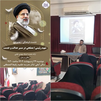 این نشست در ۲۹ اردیبهشت ساعت ۹:۳۰ با موضوع" شهید رئیسی ؛ مصلحی در مسیر عدالت و خدمت" با حضور اساتید، کادر و طلاب در سالن آمفی تئاتر این مدرسه برگزار گردید.