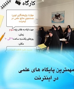کارگاه مهارت پژوهشگری نوین باهدف ارتقاء توانمندی های پژوهشی وآشنایی باابزارهای جدیدجستجوواستفاده ازمنابع علمی دراینترنت جهت ارائه به طلاب پایه سوم درمدرسه علمیه فاطمه الزهراء(سلام الله علیها) برگزارشد.