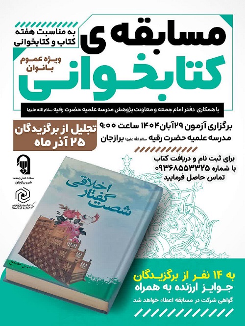 به گزارش روابط عمومی مدرسه علمیه حضرت رقیه (س) برازجان، معاونت پژوهش مدرسه علمیه خواهران برازجان گفت: به مناسبت هفته کتاب و کتابخوانی مسابقه بزرگ کتابخوانی«شصت گفتار اخلاقی» تالیف موسس مدرسه حجت الاسلام مصلح به منظور ارج نهادن به مقام والای کتاب و گسترش فرهنگ مطالعه در میان بانوان برگزار میگردد.