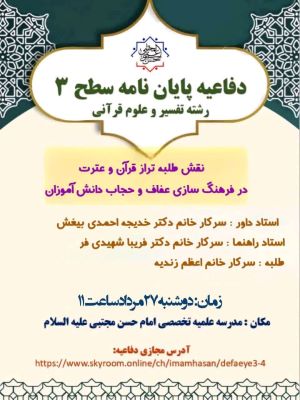 معاونت پژوهش مدرسه علمیه تخصصی امام حسن مجتبی علیه السلام دفاعیه طلبه رشته تفسیر و علوم قرآنی را برگزار می کند.