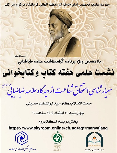 مدرسه علمیه تخصصی امام خامنه ای مدظله العالی کرمانشاه،طی گرامیداشت هفته کتاب وکتابخوانی ، نشستی علمی به مناسبت پاسداشت مقام شامخ جناب علامه طباطبایی (ره) با همکاری دفتر مجمع عالی حکمت و مرکز آموزش عالی حوزوی علامه طباطبایی (ره) کرمانشاه با عنوان"معیار شناسی استحقاق شفاعت از دیدگاه علامه طباطبایی علیه الرحمه" با ارائه استاد گرانقدر جناب آقای حجت الاسلام دکتر ابوالفضل حسینی با حضور علما ،فضلا، اساتید و طلاب مدرسه علمیه تخصصی امام خامنه ای حفظه الله در قالب یازدهمین ویژه برنامه گرامیداشت جناب علامه (ره)در روز چهارشنبه 21آبانماه 1404برگزار نمود.لازم به ذکر است امکان حضور در این نشست در بستر اسکای روم به صورت سراسری فراهم و به تمام شرکت کنندگان گواهی حضور اعطا شد.