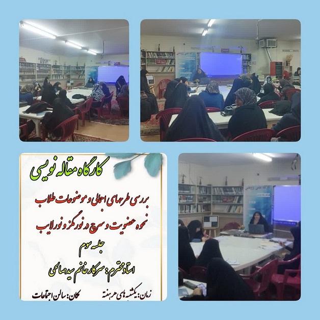 با حضور استاد روش تحقیق سه کارگاه مقاله نویسی با موضوع بررسی طرحهای اجمالی و موضوعات طلاب و همچنین آموزش نحوه عضویت در سایت های نور (نورلایب ونورمگز).