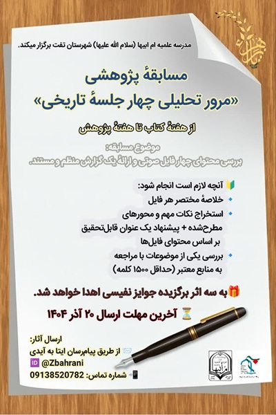 معاونت پژوهش مدرسه علمیه امابیها سلاماللهعلیها شهرستان تفت برگزارکنندهٔ مسابقهٔ پژوهشی با عنوان «مرور تحلیلی چهار جلسهٔ تاریخی» اعلام نمود. این مسابقه با هدف تقویت مهارتهای تحلیلی، مستندسازی صوتی-تحلیلی و تشویق طلاب به پژوهش میدانی و متنی برگزار میشود.