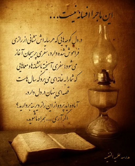 در این برنامه که حاصل اجرای مشترک فرهنگی پژوهشی مدرسه علمیه النفیسه می باشد طرح و ایده برگزاری ترکیبی از تئاتر و اتاق فرار با فضا سازی کوچه های بنی هاشم و منزل حضرت زهرا سلام الله علیها ( ویژه نوجوانان متوسطه اول ودوم )با مضمونی معنوی و تاثیر گذار در قالب 4قرفه در دو قرفه اول به رمز گشایی دفترچه خاطراتی که باستان شناس پیدا کرده است می پردازند و با هیجان چالش و موانع روبرو می شوند باید با کمک راهنما این چالش ها و رمزو را کشف نموده و اجازه ورود به قرفه بعدی را پیدا کنند تا در قرفه سوم نام نویسنده خاطرات را پیدا کرده و در قرفه چهارم به منزل حضرت زهرا پیدا کرده با فضای معنوی و تاثیر گذار آنجا آشنا شده و در پایان با صحبتهایی خانم مورد نظر پیرامون شهادت حضرت و ربط آن به ظهور آقا امام زمان و قرائت دعای فرج به پایان می رسد.