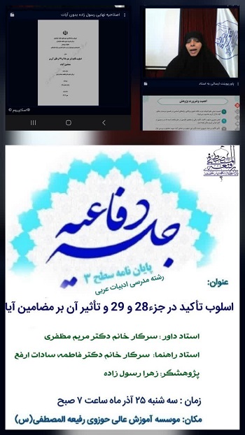 برگزاری جلسه دفاعیه سطح ۳ رشته مدرسی ادبیات عربی باعنوان: "اسلوب تأکید در جزء28 و 29 و تأثیر آن بر مضامین آیات " توسط پژوهشگرمحترم خانم زهرا رسول زاده با راهنمایی سرکار خانم دکتر فاطمه سادات ارفع و داوری سرکار خانم دکتر مریم مظفری در روز سه شنبه ۲۵ آذر ماه ۱۴۰۴ ساعت ۷ صبح در مدرسه علمیه تخصصی رفیعه المصطفی(س) با حضور جمعی از اساتید و طلاب برگزار گردید و پایان نامه طلبه با کسب رتبه عالی پذیرفته شد.