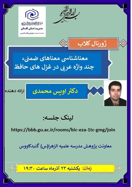 به همت معاون پژوهش مدرسه الزهرا سلام الله گنبد کاووس ژورنال کلاب باعنوان معناشناسی معناهای ضمنی چند واژه عربی در غزل های حافظ به صورت مجازی باحضوردکتر اویس محمدی استاد دانشگاه درتاریخ 23/9/1404ویژه طلاب سطح دو وسه برگزار گردید.