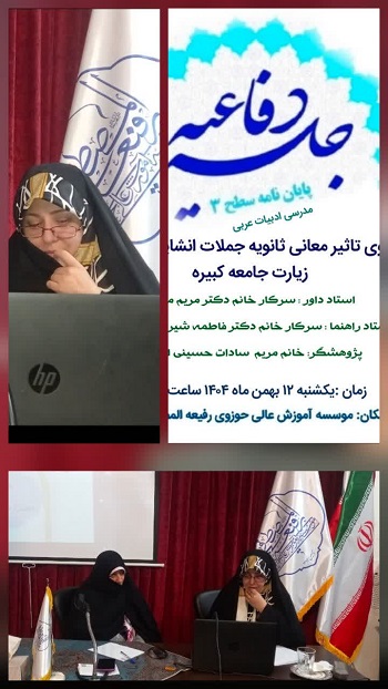 جلسه دفاع پایاننامه خانم مرضیه سادات حسینی لواسانی با عنوان «واکاوی تأثیر معانی ثانویه جملات انشایی در معنای زیارت جامعه کبیره» صبح ۱۲ بهمنماه ۱۴۰۴ در مدرسه علمیه تخصصی رفیعه المصطفی(س) برگزار شد.