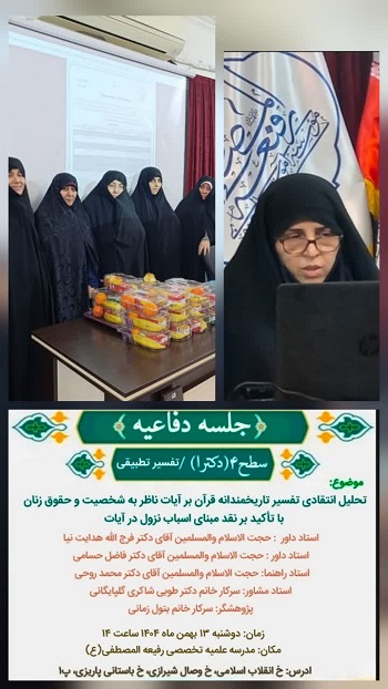 در جلسهای علمی و تخصصی، سرکار خانم بتول زمانی از رساله سطح۴ خود با عنوان «تحلیل انتقادی تفسیر تاریخمندانه قرآن بر آیات ناظر به شخصیت و حقوق زنان با تأکید بر نقد مبنای اسباب نزول در آیات» دفاع کرد و با نمره عالی پذیرفته شد.