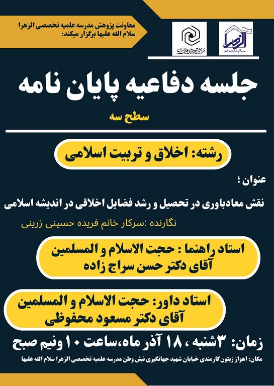 در این جلسه، سرکار خانم فریده حسینی زرینی، از طلاب توانمند این مدرسه، از پایاننامه سطح ۳ خود با عنوان «نقش معادباوری در تحصیل و رشد فضایل اخلاقی در اندیشه اسلامی» دفاع خواهد کرد. این پژوهش که با راهنمایی علمی ارزشمند حجت الاسلام و المسلمین آقای دکتر حسن سراج زاده و داوری دقیق حجتالاسلام والمسلمین آقای دکتر مسعود محفوظی صورت پذیرفته است، به بررسی یکی از کلیدیترین مبانی تربیت اخلاقی در اسلام میپردازد. اندیشه معاد و باور به زندگی پس از مرگ، همواره به عنوان یکی از ستونهای اصلی نظام اعتقادی و اخلاقی اسلام، نقشی بنیادین در شکلگیری شخصیت، انگیزه بخشی به اعمال نیک و بازدارندگی از اعمال ناشایست ایفا نموده است. این پایاننامه تلاش دارد تا با استناد به منابع غنی اسلامی، پیوند عمیق میان باور به حسابرسی اعمال و پاداش و کیفر اخروی با فرایند اکتساب و پرورش فضایل اخلاقی چون صداقت، عدالت، ایثار، صبر و استقامت را تبیین نماید. پژوهشگر در این تحقیق، با رویکردی علمی و تحلیلی، به تشریح چگونگی تأثیرگذاری اعتقاد به معاد بر تقویت انگیزههای درونی برای پایبندی به اصول اخلاقی و پرهیز از رذایل پرداخته است.